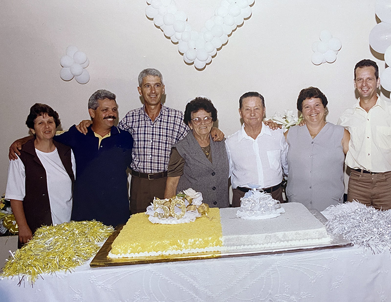 Ali no sítio tinha a casa dos meus avós; a casa dos meus pais e a casa dos meus tios José Humberto e Ana Spagnol. E o meu tio mais novo, que casou em 1993, morava ali com os meus avós – ele faleceu em 2003. Hoje, só os meus pais residem lá. Então, a gente recebia os familiares tanto do lado De Gaspari da minha avó quanto do lado Trevisol do meu avô. Todos eram recebidos ali na cozinha de fora. Na garagem ao lado, é onde a gente fazia as festas. Por isso, eu tive contato com muitas gerações.